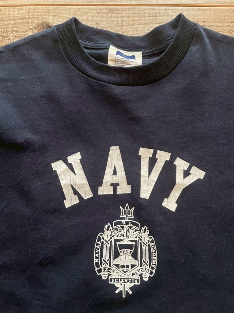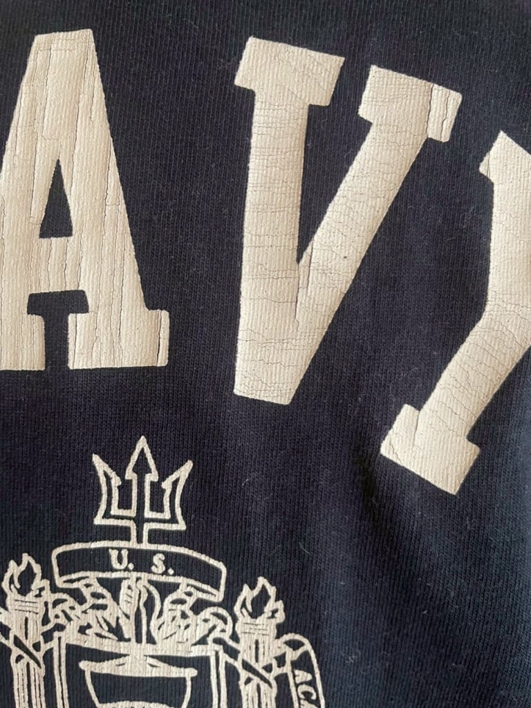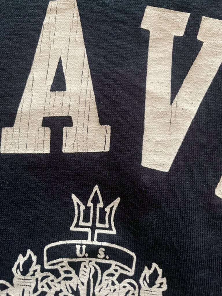 ・フロントのプリントはヴィンテージ感がでるよう濃色ボディにはひび割れラバープリント、淡色ボディには染込みプリントを施しております。