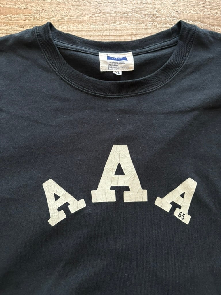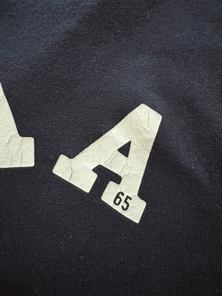 ・フロントのプリントはヴィンテージ感がでるよう濃色ボディにはひび割れラバープリント、淡色ボディには染込みプリントを施しております。