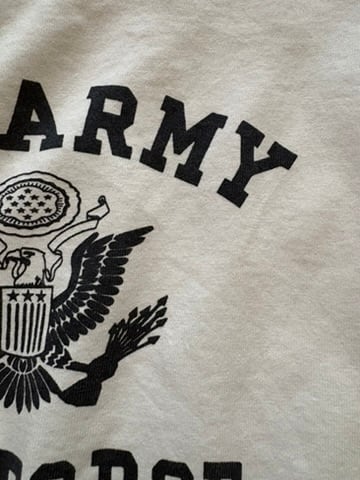 ・フロントのプリントはヴィンテージ感がでるよう濃色ボディにはひび割れラバープリント、淡色ボディには染込みプリントを施しております。